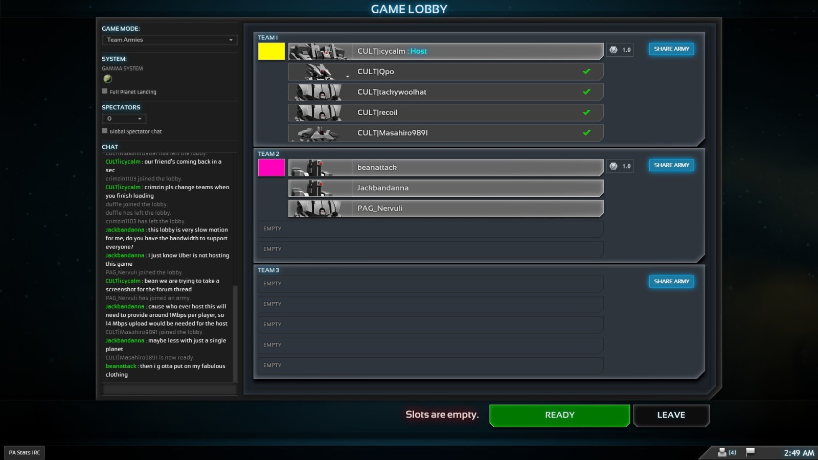 I wrote:I just want to say thanks to everyone who played in our big 5v5v5 game. It was insane with so many units and our clan being hit from 3 different sides, awesome stuff. And anyone curious about the stats for the game: http://www.pastats.com/chart?gameId=228253. Also one of our clan members (thanks Qpo) took some pictures of the lobby and commander screens to show how cool it looks with big teams:
