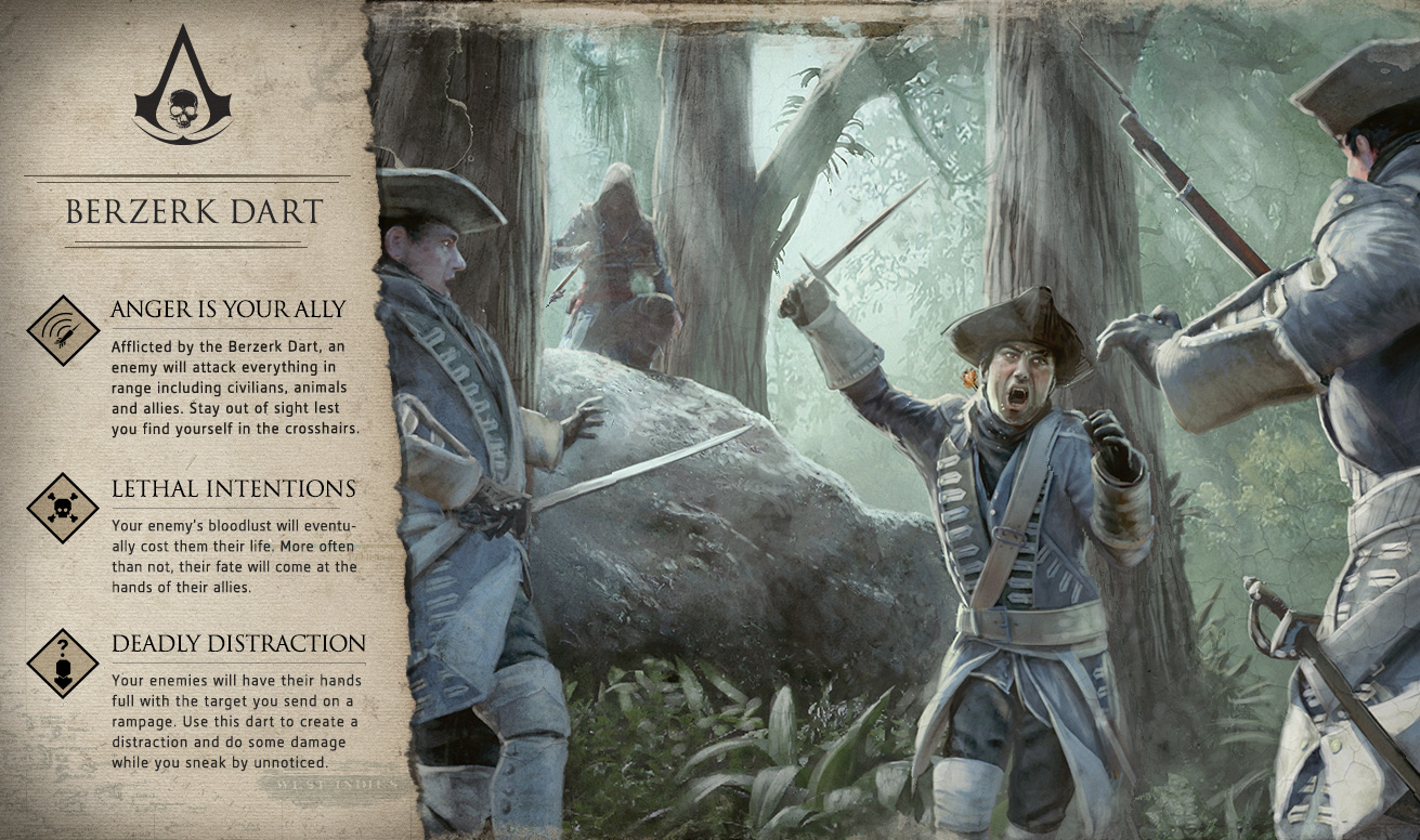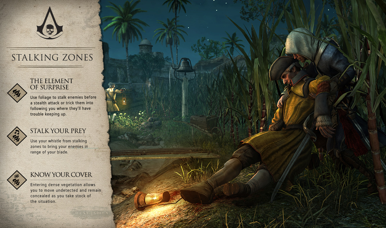 Like any great open-world game, Assassin’s Creed IV Black Flag is set up to work with all kinds of play styles. You can take on most missions any way you like, but if you want to fully embrace the Creed and slip in and out completely undetected, we have a handful of infographics showing the many options available to you, just like the naval infographics we brought you. We’ve got everything from details on Edward’s blowpipe and its various types of ammunition to the stalking zones, which Edward can slip through in total silence…