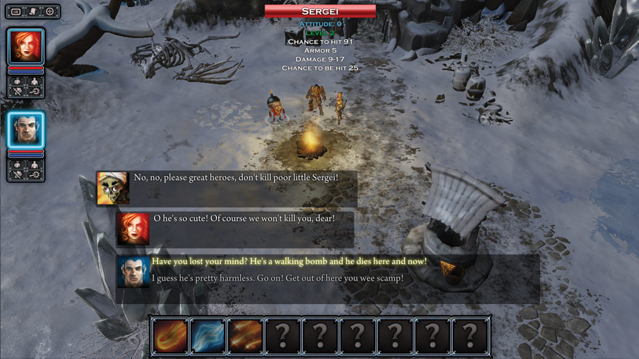 These games are TACTICAL GAMES WITH A LIGHT EXPLORATION ASPECT, RETARDS. The role-playing is barely 2% of the game AND IT'S RETARDED. It's stupid. It's boring. That's why we went straight for the fights instead of the dialogues. We do the dialogues as a break from the fights now and then, not the other way around, because the person leading this team has been playing REAL role-playing games before you were born, AND computer pseudo-RPGs, and knows the best way to enjoy both of them.