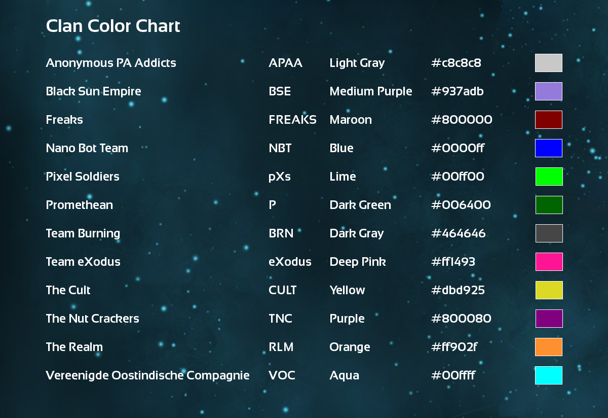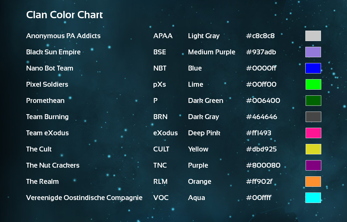All new clans that join us have to post in this thread and pick a color that hasn't been picked yet. You cannot take a color even from a clan which has stopped participating. An inactive clan's color will become available only once we have reached the 32-color limit, and a new clan wants to come in and there's no color left for them (i.e. the 33rd clan, and every clan after it). At that point, each new clan will get the color of the clan that has been inactive for the longest time, in descending order. For example, Team eXodus hasn't played since CW2, so if we reach the 33rd clan and eXodus hasn't returned, the 33rd clan will have to take eXodus's pink color, and if eXodus returns at some point after that, they will have to take a color from another inactive clan in a similar manner.