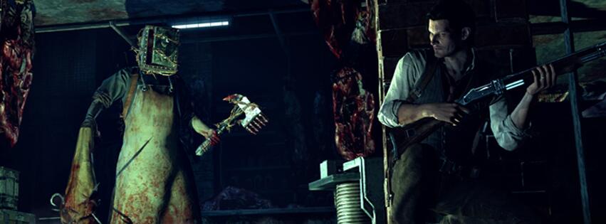 When Sebastian wakes up, he’s hanging upside down in a meat-locker, the lair of a madman, surrounded by victims of a similar fate. A giant, hulking butcher in a stained wife-beater and apron lumbers in and cuts down one of Sebastian’s hanging fellows, dragging him off to a well-worn butcher’s block to gut him with an indelicate squelch. The scene is immediately otherworldly, a decrepit, blood-splattered alternate asylum lit by a flickering fluorescent bulb, too at odds with the game’s previous environment to be in any way grounded in ‘reality’.