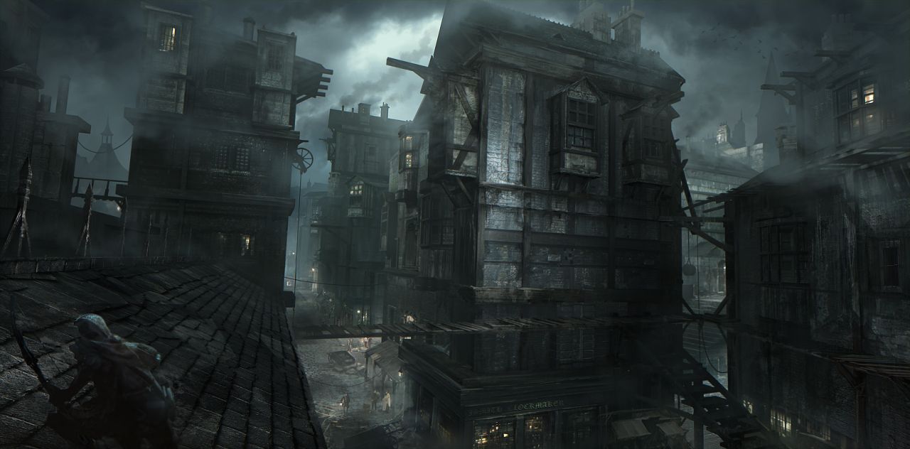 Garrett, motivated by the thrill of stealing something that others can’t, does not care for heroism. He sees the oppressive ruling as an opportunity to make money. He finds his way into the Stonemarket district in the back of a covered wagon, and watches the bodies of plague victims pile up in the street corners. Guards, meanwhile, are settling small civil disputes with force. And wealthy men stroll by with their own guards.