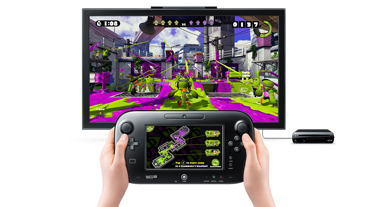 Look down at the GamePad's screen and you'll get an instant view of the ebb and flow of "battle" in real time, with a top-down view of ink-soaked walls changing as the teams fight back and forth. As you make your way towards the rival base, you'll find yourself slowed by the opposing team's ink, forcing you to constantly shift the terrain to your advantage.