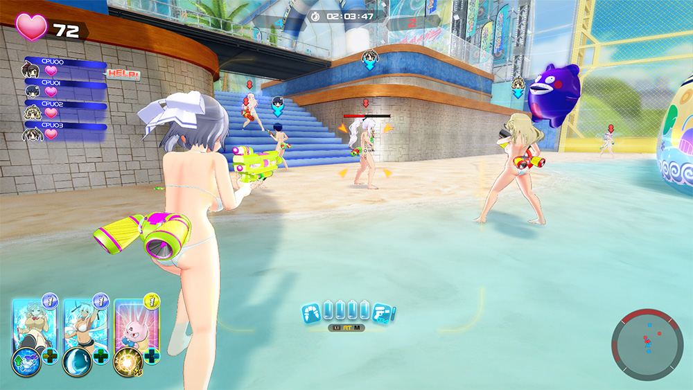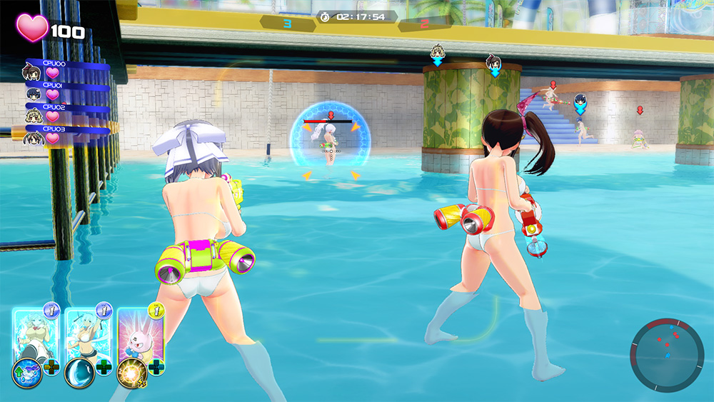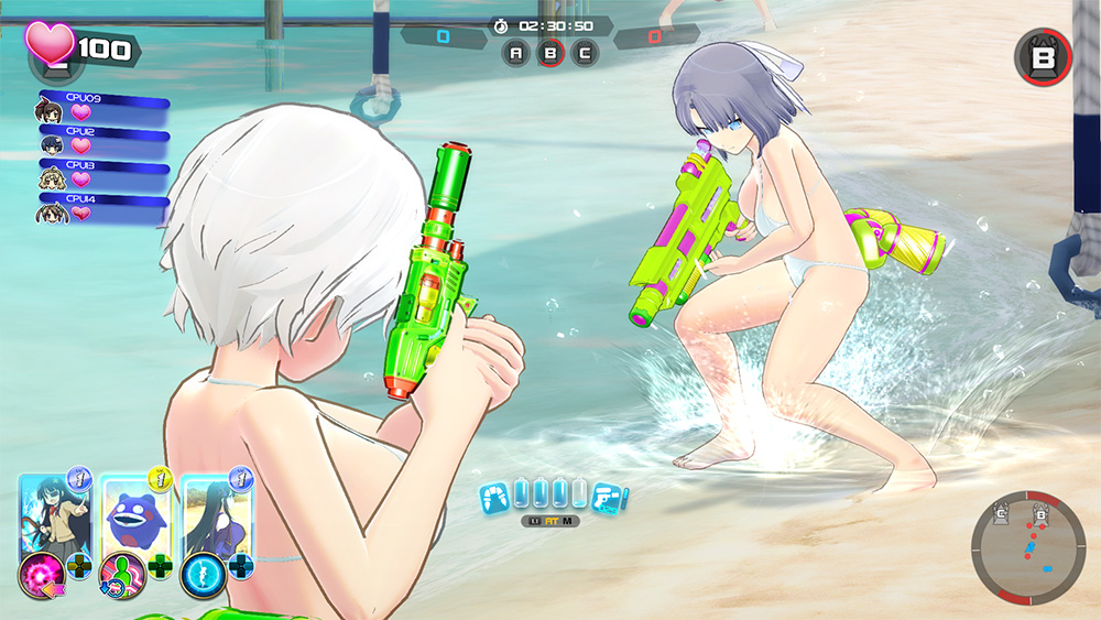 Water guns come in various forms. There are dual-wield pistols, gatling guns, sniper rifles, and many others. These weapons have special attack effects that are set through cards. The water gun battles are done in 5 vs. 5 matchups and plays in third-person shooter style.