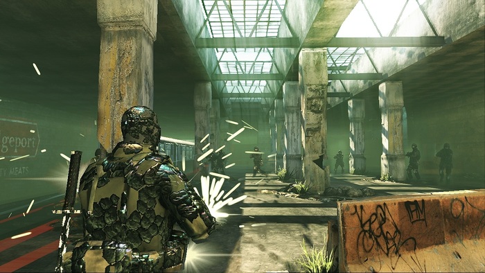 "There's a lot of chaos in such a change that we want to explore along with the player. The single-player story levels themselves will be designed so that how you choose to approach them really changes the experience. Say you want to get through a checkpoint. You can go in guns a-blazing, you can mindjack one guy and have him shoot the others, you can summon a huge tornado or title wave to level it. You can find a roost a ways back, lure the enemies into a trap, or snipe them one by one. You can stealth by without ever being noticed. The single-player game will be hub-and-spoke: there will be a central hub area that is more open world so you can get missions, gear, get a feel for the world, and of course have sandbox fun with your character build and abilities. The spokes will be those more linear story scenarios I mentioned. An hour of play would likely be some time in the hub messing around and gearing up, then taking on a story missions."