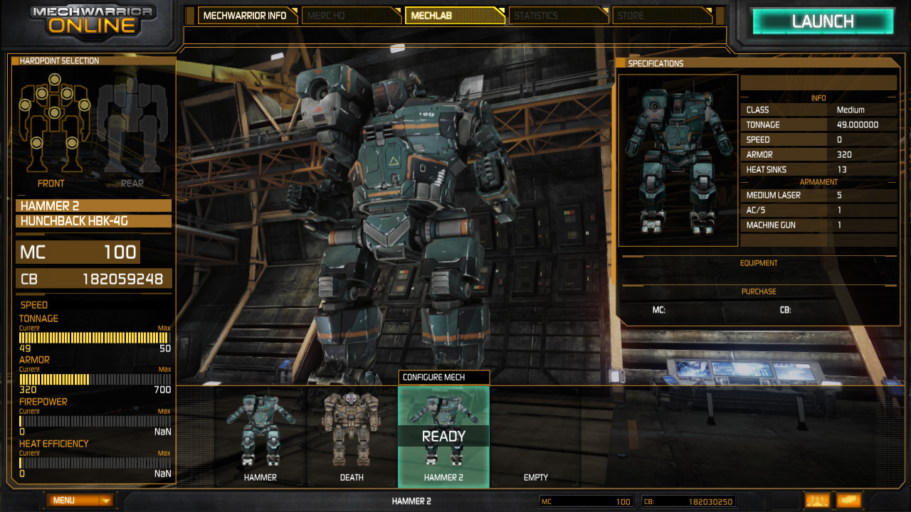 MechLab UI ImprovementsFurther refinements to buying and selling `Mechs, readying `Mechs, and a visualization of hardpoints, weapons, and critical space directly on the `Mech itself, will make their appearance March 5th. These additions make a huge improvement to understanding the state of your BattleMech, along with helping understand the differences between variants when making a purchasing decision.