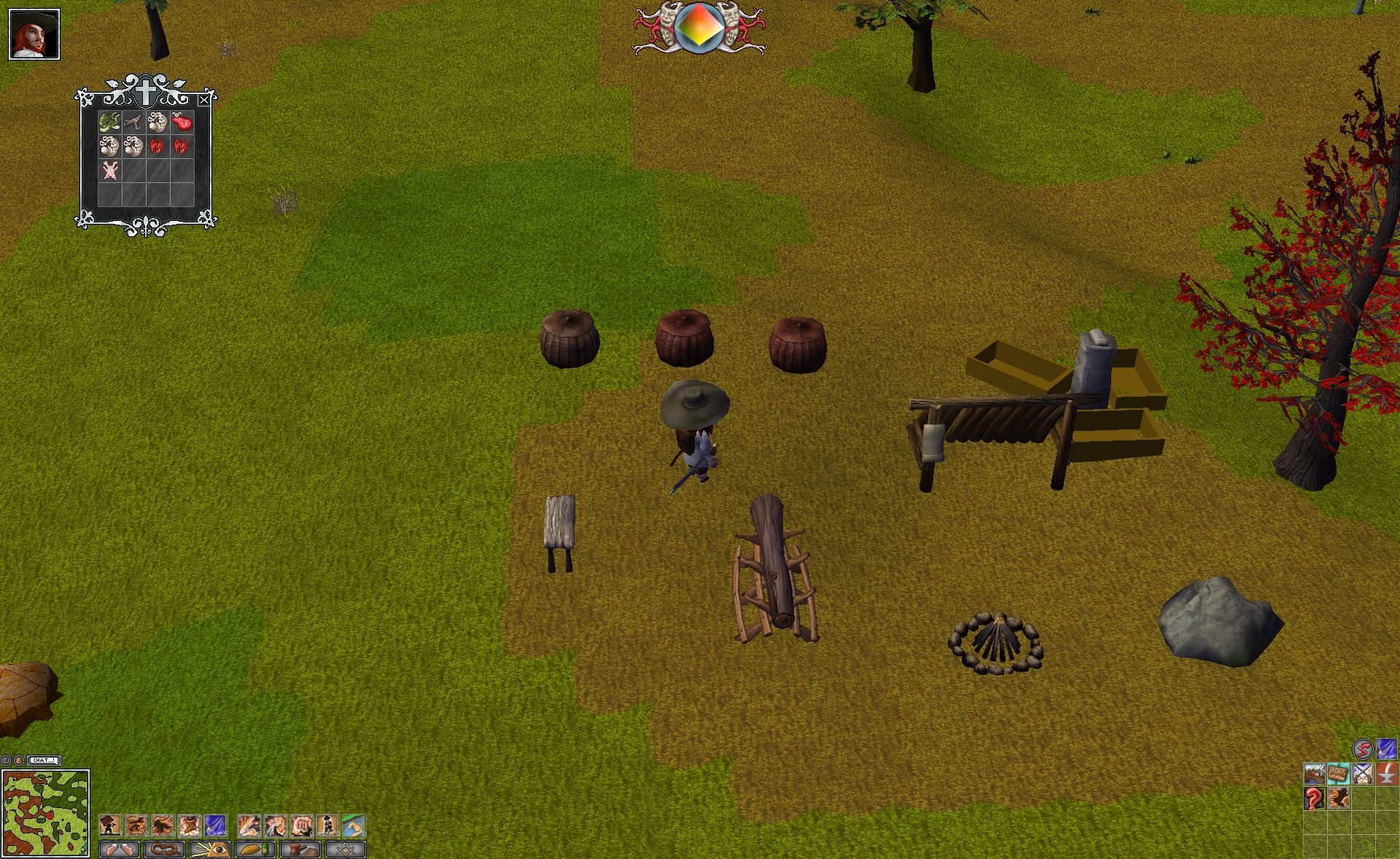 This is where the game starts to get crazy. This is set in ye olde times when America is just being settled, right? So there’s no map of the area–I have no clue where I am in relation to Boston or anything else in this game. I am now alone with my trees, my shelter, and the developer that led me here. (And to be fair, I can’t even be 100% sure that this guy’s the developer’s character. You can’t see anyone else’s name: you just right-click people and name them yourself, so you have to trust they are who they say they are.)