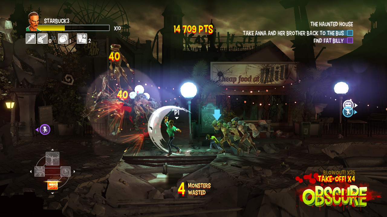 Playable alone and in cooperative mode, Obscure lets you play as one of four unlikely heroes; students, each with unique skills and abilities that develop throughout the adventure. Geared toward action and all-out brawling, Obscure's combat emphasizes combos, follow-up attacks, and score-multipliers! Survive against packs of monsters trying to skin you alive, discover new weapons, and complete objectives throughout a variety of huge, non-linear levels. Overshooting the scores will earn you experience points to level your character up, unlocking new weapons, skills, and other devastating abilities! At any time, you can even get back to some of earlier levels to try your new toys and beat your scores!