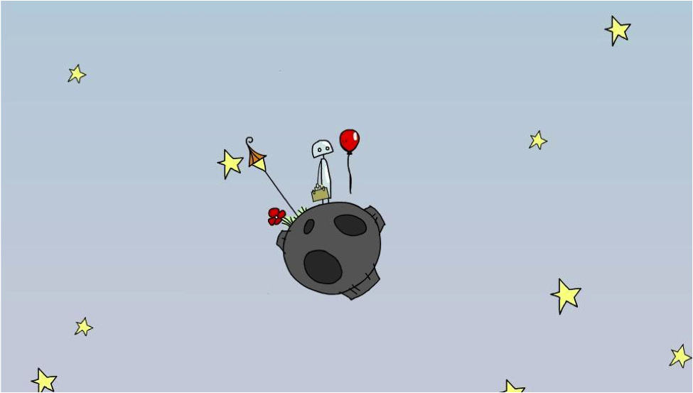 In Doki-Doki Universe, you’re a robot named Model QT377665, or QT3 for short (QT – get it?). Your human family said to wait here on this asteroid, and they would be right back to get you.