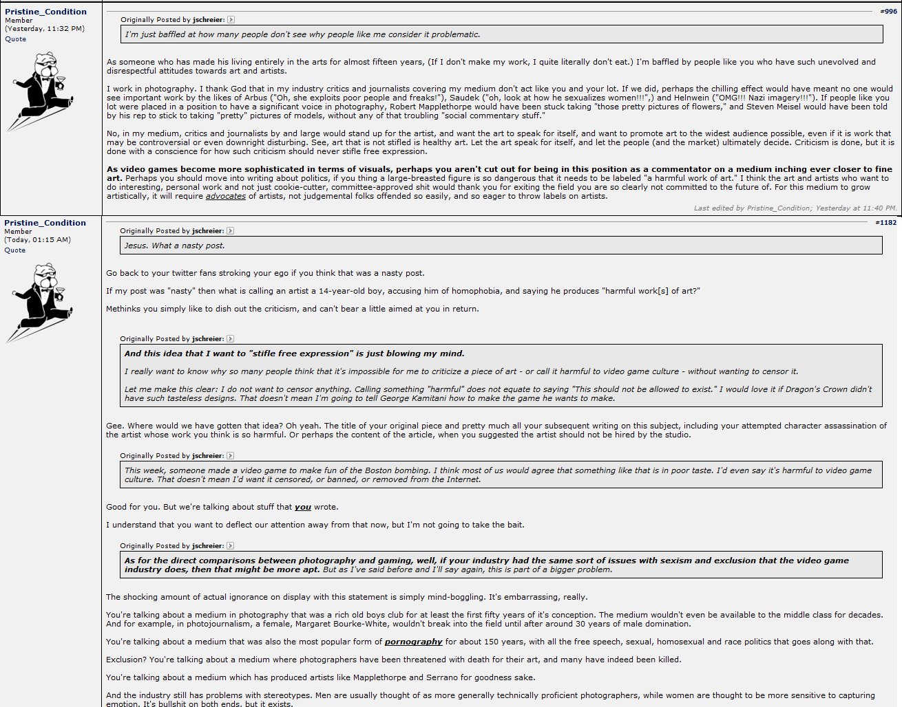The human beings that actually buy and play these games are still a small subset of human beings. They are exactly the same people that think The Walking Dead is a profound drama and that X-Men is a legitimate dramatization of the Martin Luther King Jr. vs. Malcolm X debates on racial justice. You know. Nerds. People are linking here fawning articles in fora of mainstream authority like the New York Times and Forbes, but it's not like the guys those places hired to write those articles aren't in that same nerd demographic. You think the EIC of the New York Times gives a shit what his videogame columnist writes? As long as it's grammatically correct he'll print it. Those articles exist because the videogame industry now makes x billion dollars a year which makes it worth my while to put it in my newspaper. They all have that same desperate plea for legitimacy that they've always had.