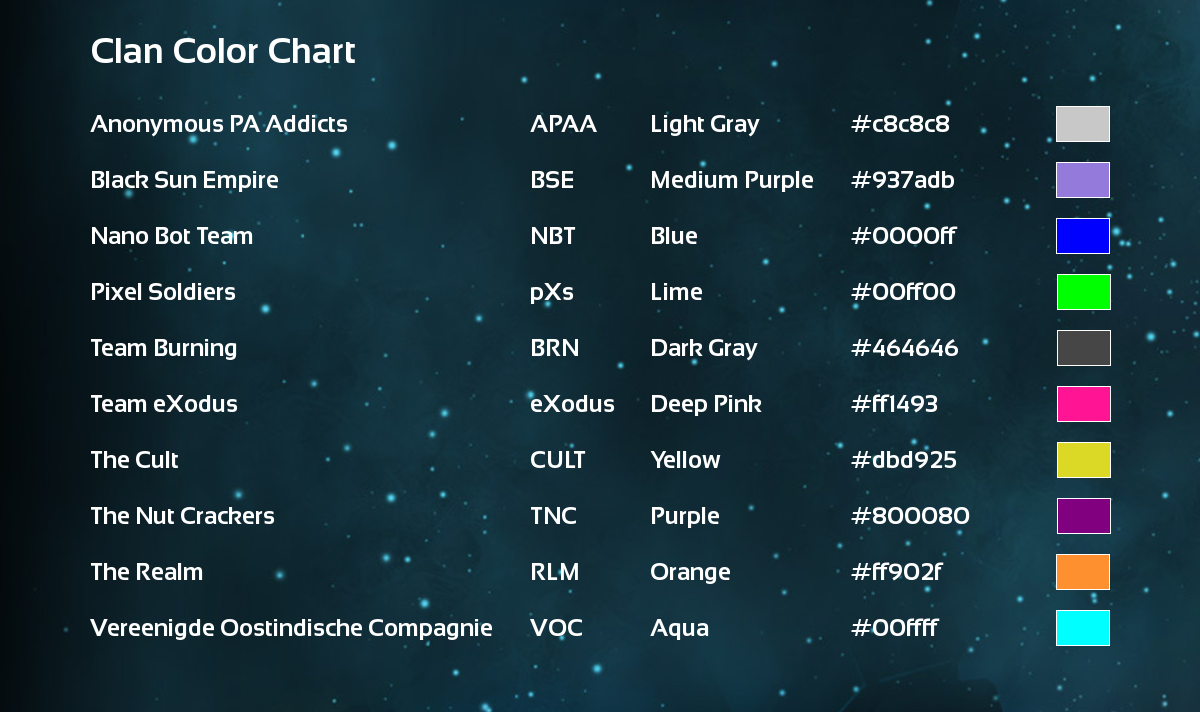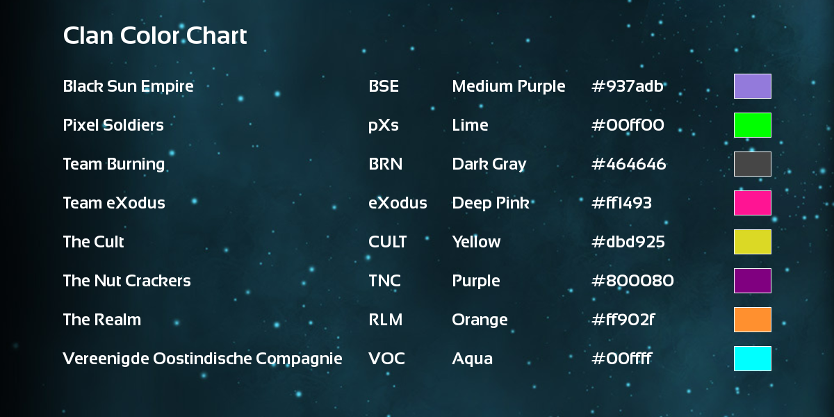 All new clans that join us have to post in this thread and pick a color that hasn't been picked yet. You cannot take a color even from a clan which has stopped participating. An inactive clan's color will become available only once we have reached the 32-color limit, and a new clan wants to come in and there's no color left for them (i.e. the 33rd clan, and every clan after it). At that point, each new clan will get the color of the clan that has been inactive for the longest time, in descending order. For example, Team eXodus hasn't played since CW2, so if we reach the 33rd clan and eXodus hasn't returned, the 33rd clan will have to take eXodus's pink color, and if eXodus returns at some point after that, they will have to take a color from another inactive clan in a similar manner.