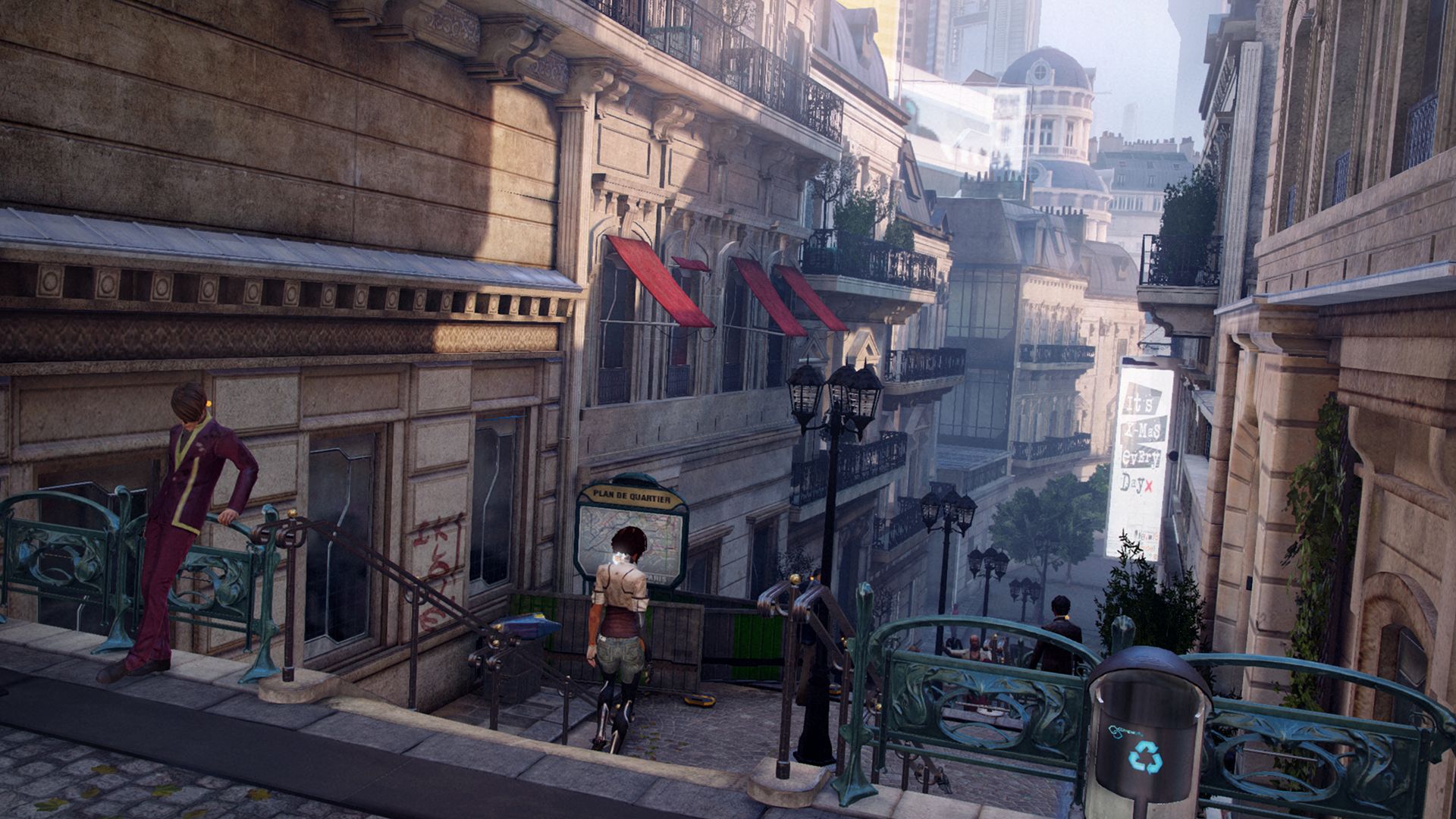 As an action-adventure game in a cyberpunk universe, Remember me alternates between combat and exploration phases, memory remixes being the culmination points that make the main story progress. There are no time paradoxes, only painful confrontation between memory and reality. The game is linearly built around a strong narrative structure, and there is little opportunity to explore future Paris.