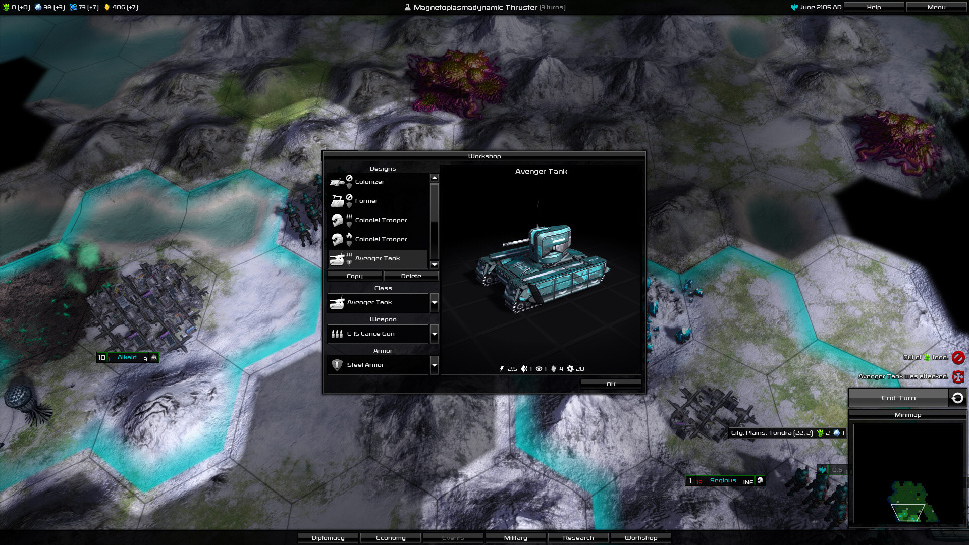 The ability to customize units is also a substantial departure from the Civ model, but not quite from the Alpha Centauri one.