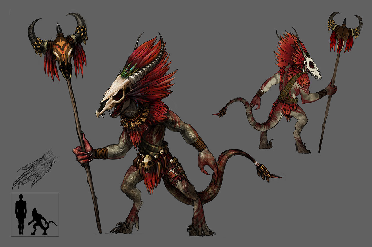 Polina has been all over the place since the presentation of the God-like Concept. She's done a bunch of interior concepts, some really cool malevolent spirit-like concepts, the lizard-like creature (below) and more! Polina takes concept development and collaboration very seriously. If I'm not paying attention, or give her a specific number, she will draw variants upon variants of thumbnails and roughs until...I think...forever. So we've restricted her to a certain number of thumbnails before a review. Otherwise we'll have to buy her a new tablet, and that is NOT in the budget!