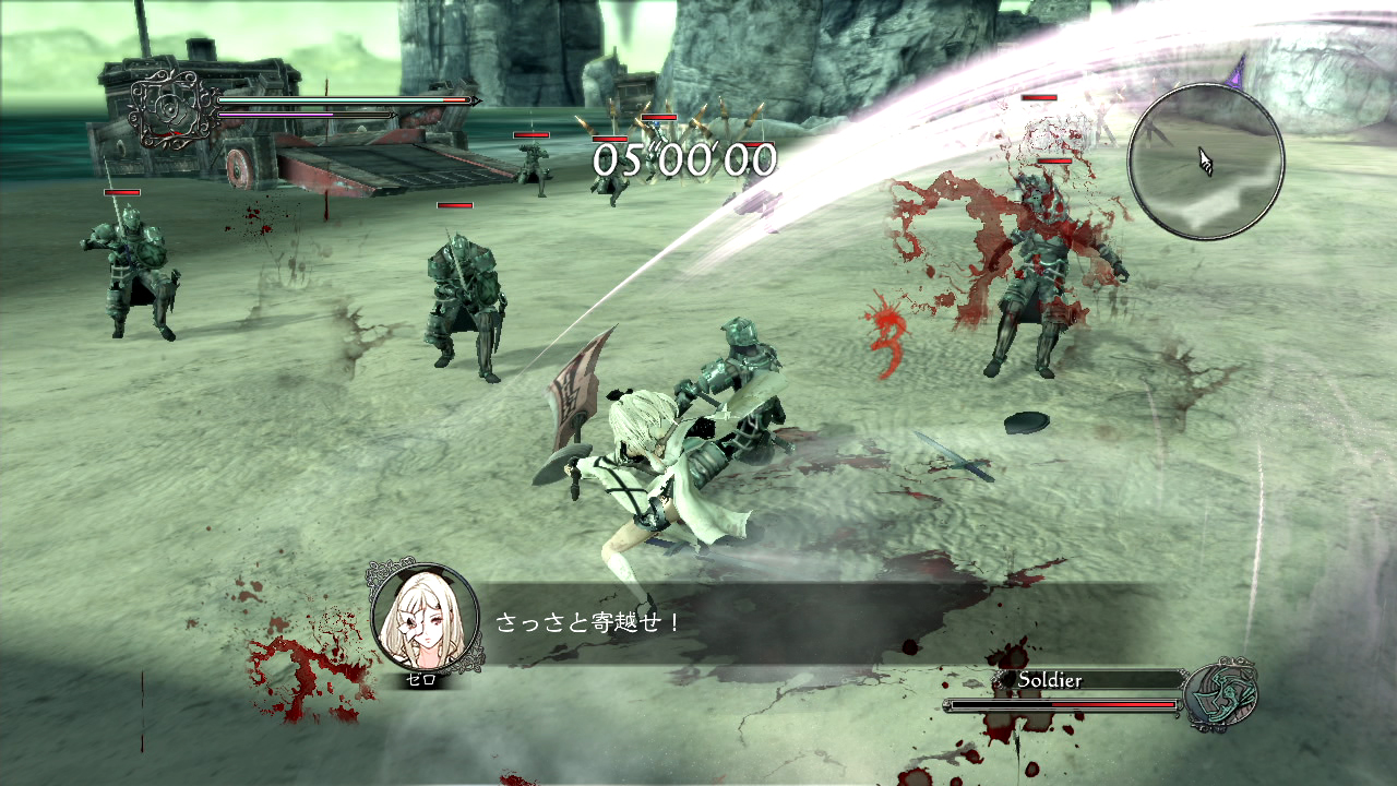 Drakengard 3 will maintain the series’ trademark high-speed action. And the style switching between air (dragon flights) and ground combat style, too. Missions are mainly land-based battles, and when splashed with blood Utautai (therefore, the player) obtain more power. A screenshot in Famitsu shows Zero fighting a large group of soldiers.