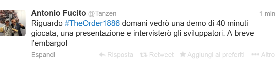 "Translation: "Tomorrow I'll watch a 40 minutes long presentation of the gameplay of the order 1886, and i will interview the developers. Soon the embargo!"