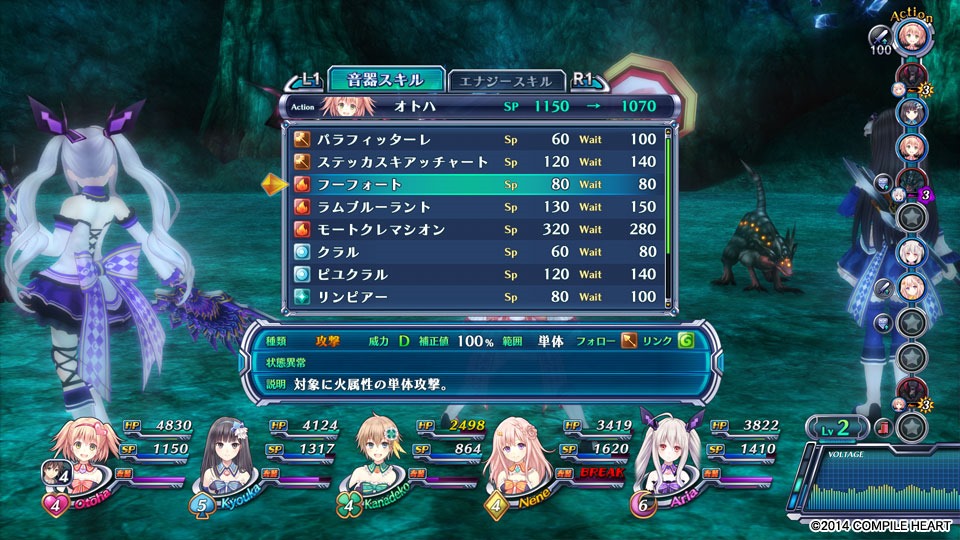 The turn order in Omega Quintet can be manipulated by having the Songstresses deliberately do things such as use weak attacks and if coordinated well in tandem with the other characters, this can allow players to pull off what’s known in the game as “Harmonics,” which are powerful moves that can have between two and five of the girls participating. To achieve this, the requisite girls’ turns have to be lined up and the active cooperation of the protagonist is also required, which, again, will be detailed farther below. Harmonics as such come in a variety of forms and aren’t useful solely in an offensive sense. That being said, when specific skills are chained together in this state regardless of execution order, it’s additionally possible to execute a “Harmonic Chain,” which is an especially powerful and flashy attack.