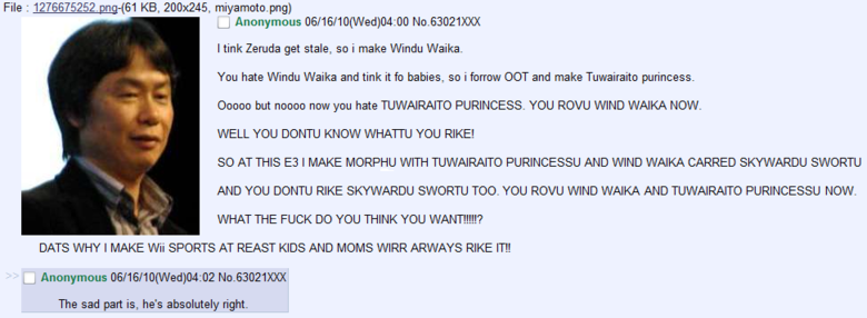 I've never watched one of these before. It's hilarious. Iwata's entire manner, etc. This middle-aged/old man in a business suit talking so earnestly about new fairies being added in a Pokemon game or whatever. His manner is so cute it makes me want to buy everything he's selling just to make sure his company continues to do well and he doesn't become sad. But honestly the U has nothing beyond Platinum's games, and even those are a disgrace, a crime against the artform. Platinum should be working on next-gen titles; you can't fucking shackle the best action game maker in the world to 2005 technology for christsake when all the other studios are working on new engines. The sooner they are done with Nintendo and say their goodbyes the better.