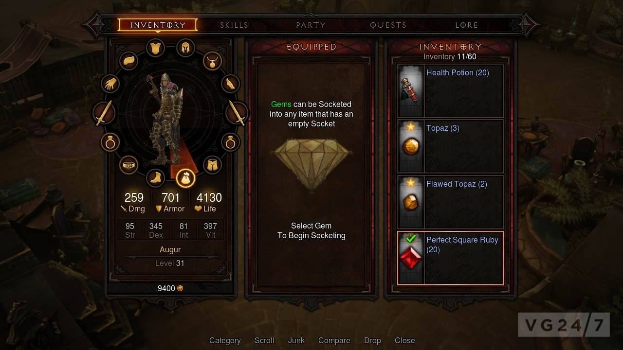 After you've dealt with the weapon damage issue, all other itemization can be summed up in two stats: Vitality and primary stat. Vitality gets turned into health in D3, stack as much of it as you can. Primary stat (Strength/Dexterity/Intelligence for different classes) gets turned into more damage, making it another version of weapon damage. Stack as much of this as you can too. Every other stat in the game? Worthless. Just stack the maximum amount of Vitality and whatever your class happens to have as its primary stat, and you're good to go in virtually every situation. You don't even need to see the character graphic in the picture above to know that it's a Barbarian, since all of the stat points and all of the gems haven gone into Strength and Vitality. It will be exactly the same for every other Barbarian too.