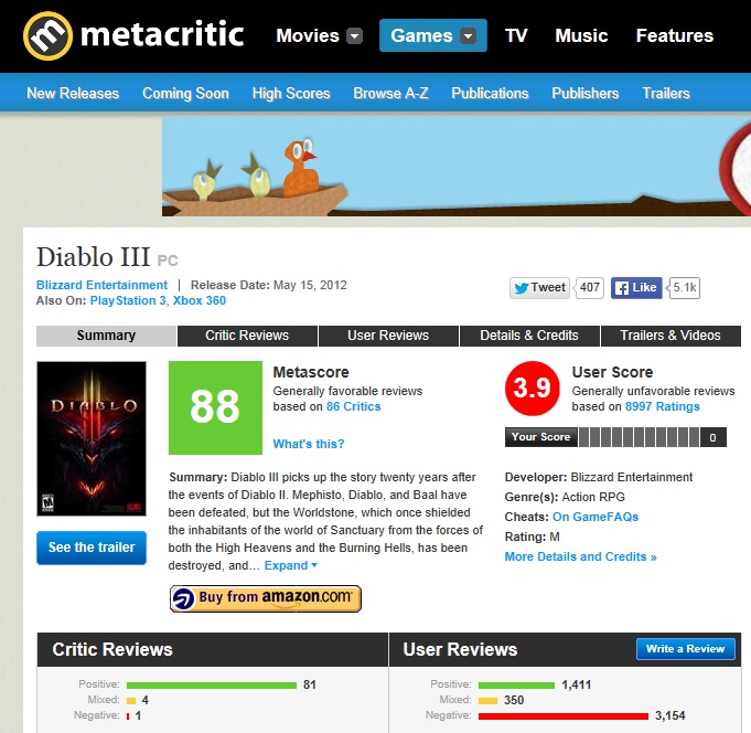 rampant problem of accounts getting hacked, which was surely made worse by the requirement for every single account to log into Blizzard's servers for every play session. Much like EA's assertion that their most recent SimCity game had to be online to function properly, the argument that D3 had to have a constant Internet connection for security purposes turned out to be a complete sham. The console versions of D3 won't require the same persistant online connection, which showcases how unnecessary the whole idea was in the first place. Blizzard insisted on an Internet connection in D3 simply because it benefitted them as a company to do so, in order to cut down on the used game market and resales of their game, and to ensure that they funneled as many people as possible to their online auction house. It certainly didn't do much of anything to stop people from pirating D3 if they wanted to do so. The whole online system had everything to do with maximizing revenue for Blizzard and Activision, and cared not a whit for improving the player experience. While I can't speak for anyone else, the whole system turned me off from wanting to play D3, and made me less inclined to continue with the game. But hey, they got my purchase money for D3, so I guess they don't care about anything else, right? Gaming publishers rarely think about anything beyond the next quarterly statement, and seem to care little about degrading the quality of a brand name if they can make a quick buck in the short term. It will be interesting to see how a Diablo 4 is received, if and when one is made.