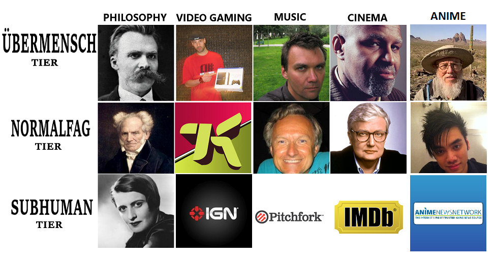 While we all have preferences, our tastes are not in any way arbitrary, but grounded in our physiological needs; just as the body requires nutrition, so do we seek to satisfy our aesthetic needs through consumption of simulacra; we consume these representations, these artifices to satisfy our psychological needs for the sensations they trigger. Sensations we, for one reason or another, can not (or will not) actualize in the real world (though that is not to say that these representations aren't themselves real--it is precisely because the mind recognizes the artifice as real that it can be a substitute in the first place). Apart from the complexity and depth parameters, the value of a work for any given individual ultimately depends on the subjective factor (one that is intersubjectively meaningful to speak of): whether or not I have need of and [can therefore] enjoy the subject matter determines whether a work has any value, for me. Such is the case for every sincere critic, whether he realizes it or not--all else is mendacious idealization. To what extent I enjoy a material is revealed in how much I actually use it (or rather, how much I desire it, truly desire it, since people often make use of some material, not because they have an actual need of its contents, but rather because doing so is something that is congruent with their self-image, and the whole experience is idealized), and my evaluations are merely stating how much I de facto enjoy a material.